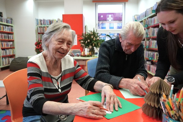 Na vánoční tvoření zavítali také klienti Alzheimer Darkov, kteří si knihovnu užívají díky pravidelným aktivizačním programům. „Každý měsíc za námi přichází knihovnice s různými přednáškami, a když nám nabídla odpolední aktivity přímo v knihovně, rozhodli jsme se s nadšením občas si udělat výlet. Pro naše klienty je to velké zpestření – změna prostředí, nové podněty i milá setkání,“ aktivizační pracovnice Adriana Sodomková vysvětlila, co pro jejich skupinu podobné akce znamenají.