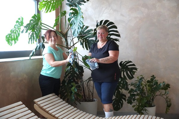 Jednou z těch, kdo mají chod wellness zóny na starosti, je wellness pracovnice a pokladní Andrea Mazurová: „Pondělní sanitární den začínáme důkladným úklidem celého wellness. Čistí se parní sauna, kde je hygiena obzvlášť důležitá, stejně tak finské sauny, infrasauna, vířivka i ochlazovací bazének. Používáme kartáče, speciální přípravky a dvojitou dezinfekci, aby bylo všechno opravdu čisté. Je to práce na celé dopoledne. Po sanitaci následuje leštění skel, madel, nerezových prvků i zrcadel, kontrola relaxačních zón a příprava prostoru na provoz.“ Samozřejmostí je také úklid a použití dezinfekce každý večer po uzavření wellness zóny. Přes noc se spouští ozonový generátor, který rozkládá pachové částice a pomáhá udržovat prostředí hygienicky čisté.