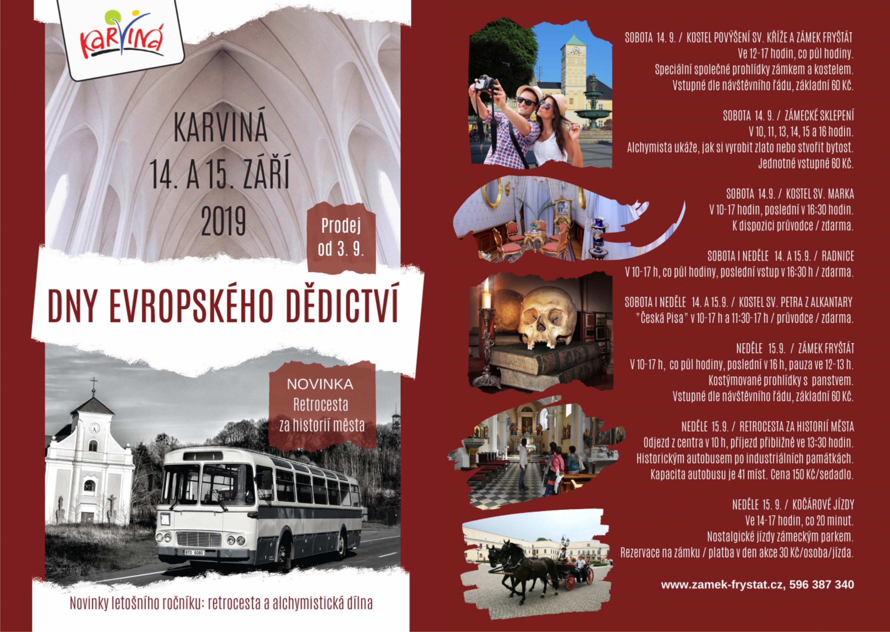 Divadlo, kočár, otevření dalších památek města. Pořádá Statutární město Karviná, www.karvina.cz, www.zamek-frystat.cz, tel.: 596 387 340, e-mail: zamek-frystat@karvina.cz. Zámek Fryštát v Karviné a další zapojené objekty.