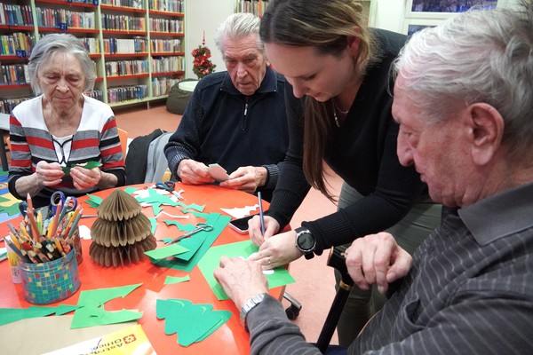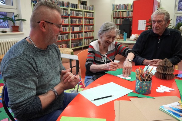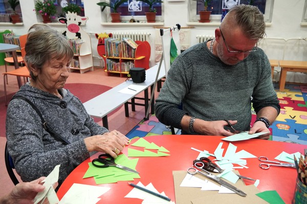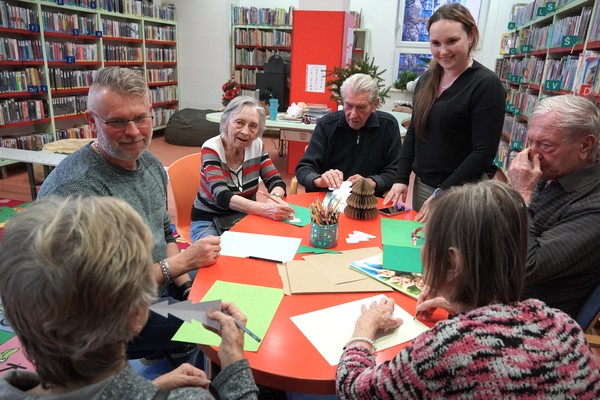 Na vánoční tvoření zavítali také klienti Alzheimer Darkov, kteří si knihovnu užívají díky pravidelným aktivizačním programům. „Každý měsíc za námi přichází knihovnice s různými přednáškami, a když nám nabídla odpolední aktivity přímo v knihovně, rozhodli jsme se s nadšením občas si udělat výlet. Pro naše klienty je to velké zpestření – změna prostředí, nové podněty i milá setkání,“ aktivizační pracovnice Adriana Sodomková vysvětlila, co pro jejich skupinu podobné akce znamenají.
