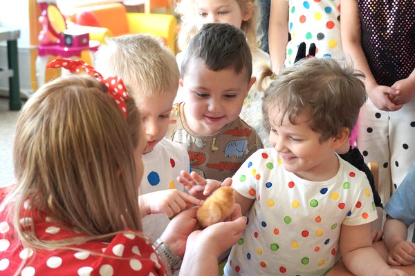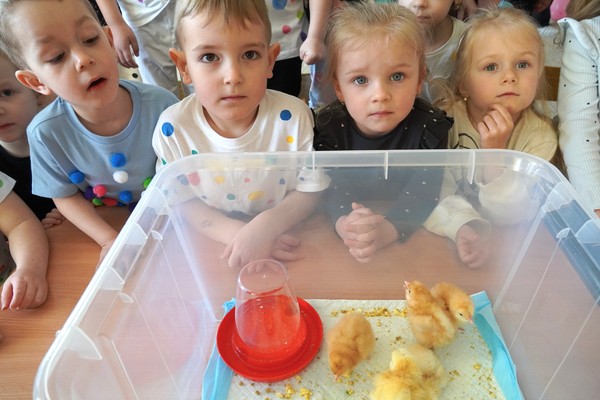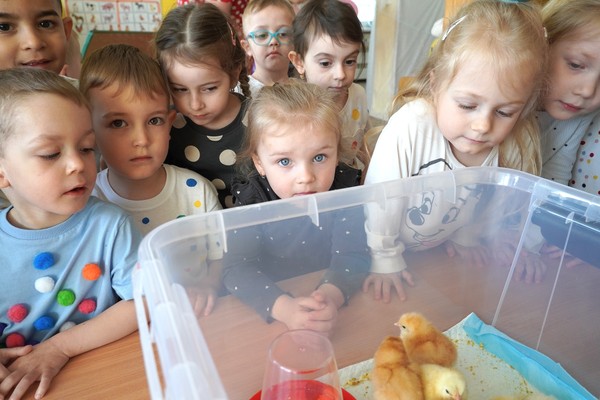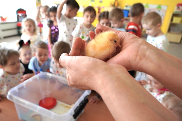 Do školky byla přivezena speciální líheň s vajíčky, ve kterých se vyvíjela kuřata. Děti tak mohly sledovat celý proces – od prvních náznaků života až po samotné líhnutí. Už několik dní po zahájení bylo patrné, že se uvnitř vajíček něco děje a děti s napětím očekávaly okamžik, kdy se kuřata začnou klubat.