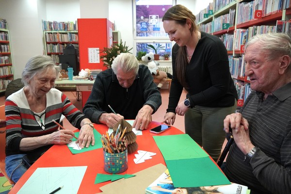 Na vánoční tvoření zavítali také klienti Alzheimer Darkov, kteří si knihovnu užívají díky pravidelným aktivizačním programům. „Každý měsíc za námi přichází knihovnice s různými přednáškami, a když nám nabídla odpolední aktivity přímo v knihovně, rozhodli jsme se s nadšením občas si udělat výlet. Pro naše klienty je to velké zpestření – změna prostředí, nové podněty i milá setkání,“ aktivizační pracovnice Adriana Sodomková vysvětlila, co pro jejich skupinu podobné akce znamenají.